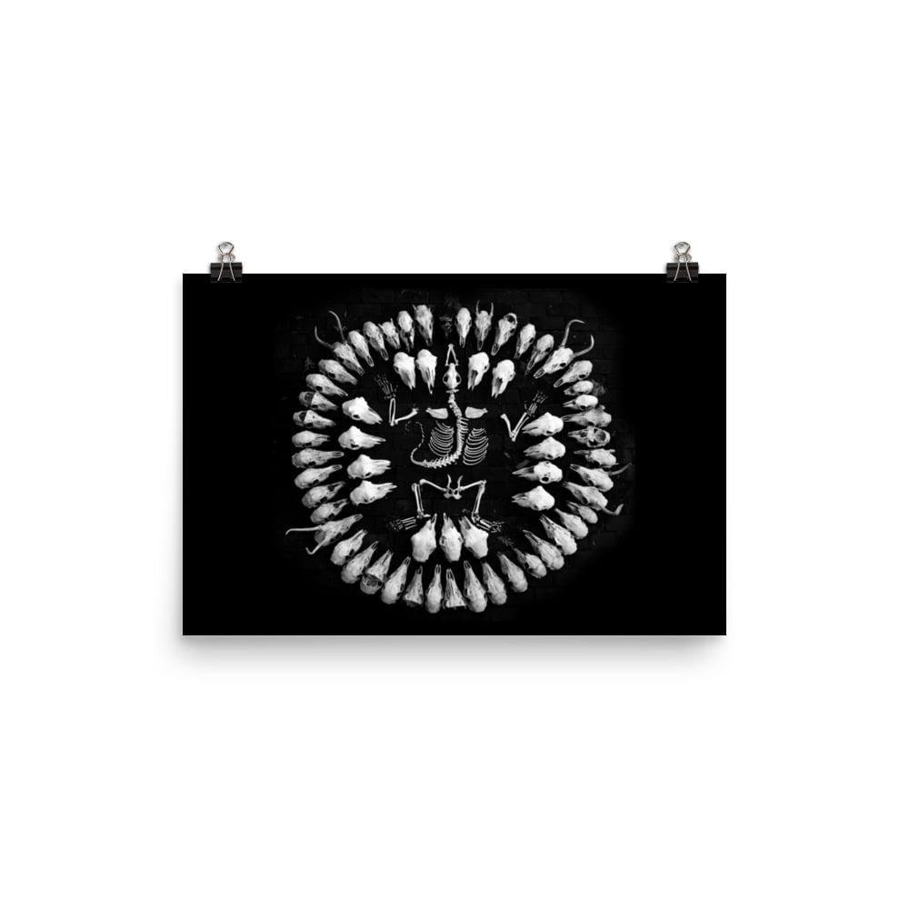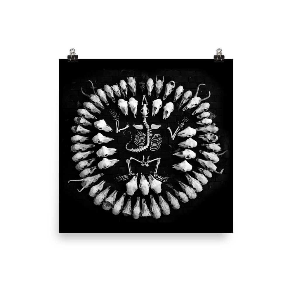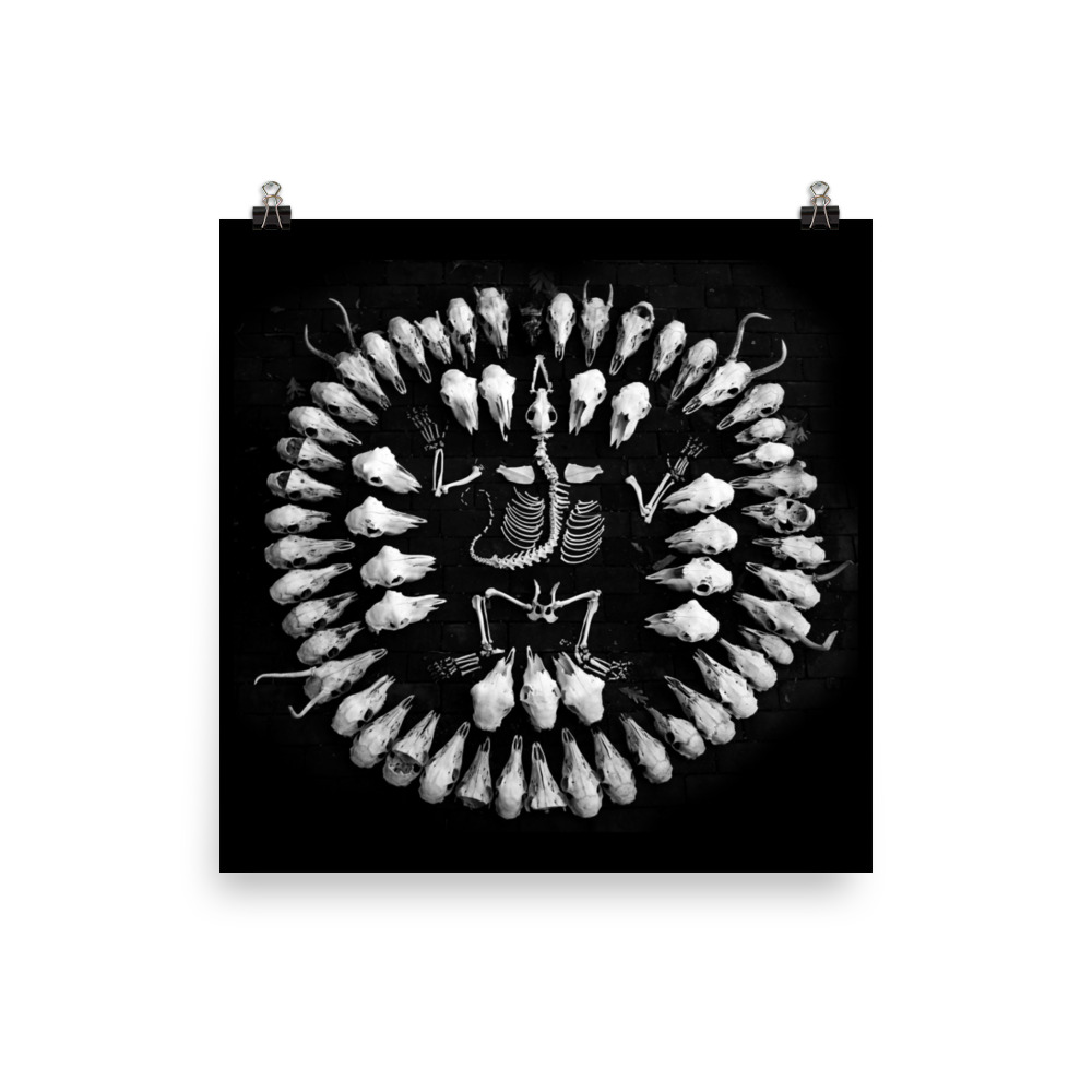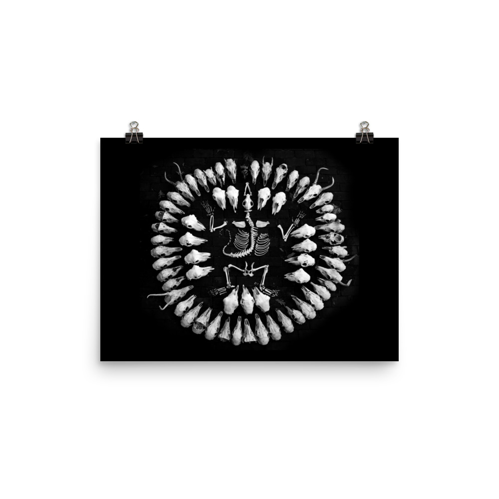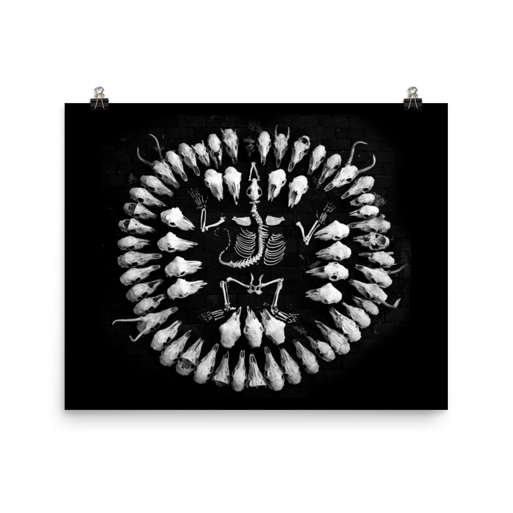 All of my pictures of animals I find/are given to me and clean myself. Nothing is harmed for my art. I processed this dog in the center surrounded by sheep and then deer skulls.