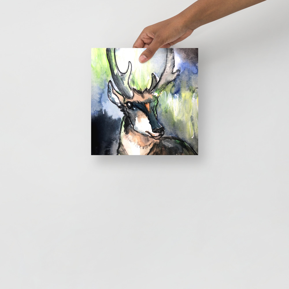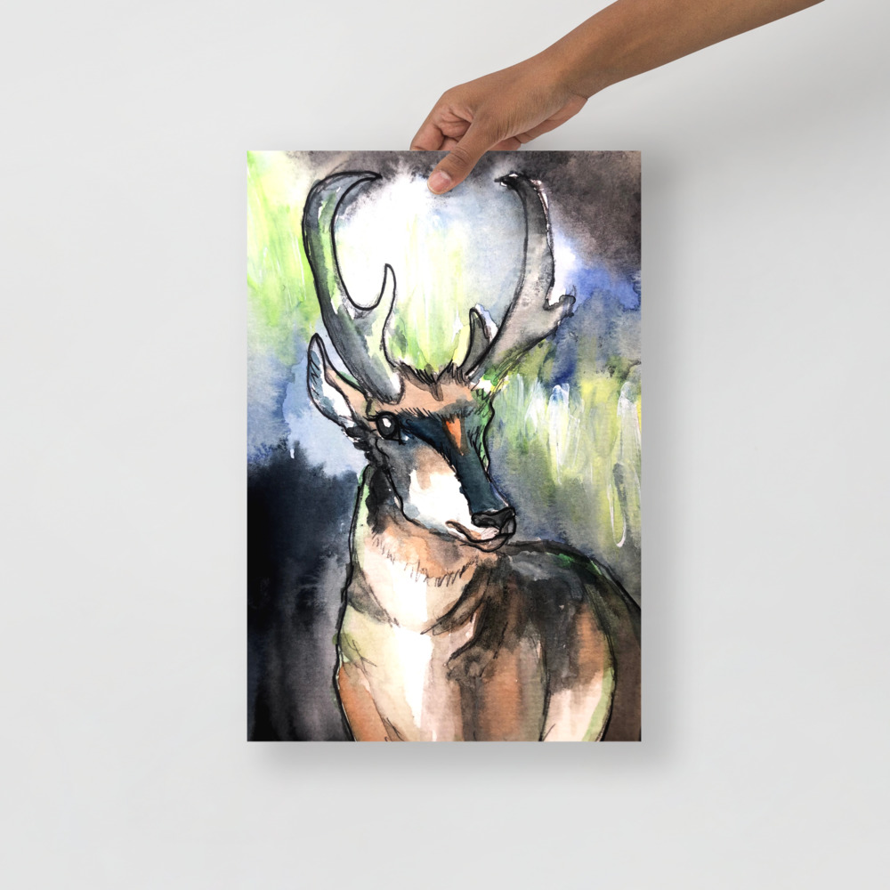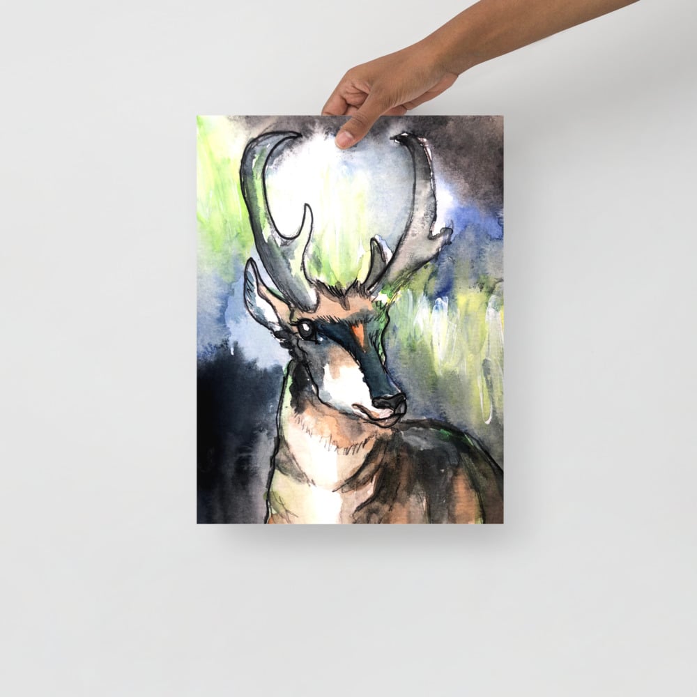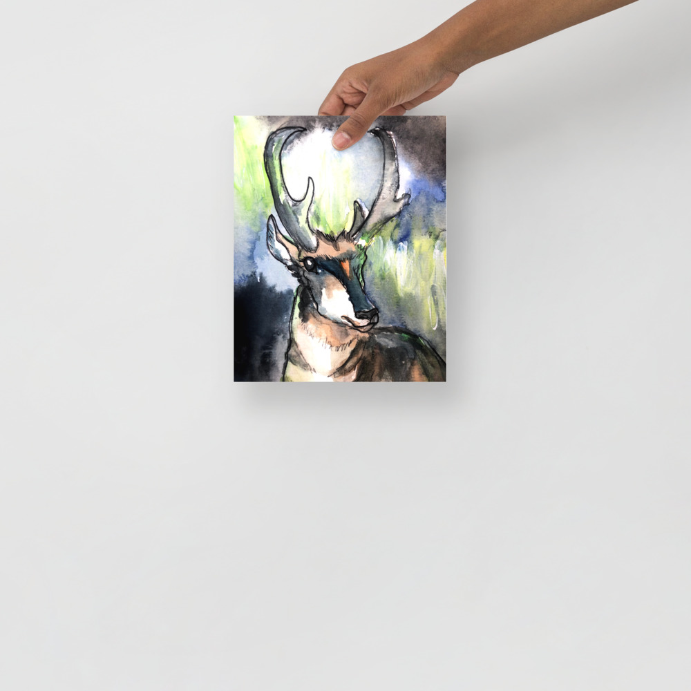 Pronghorn Antelope in the Northern Lights Watercolor Print