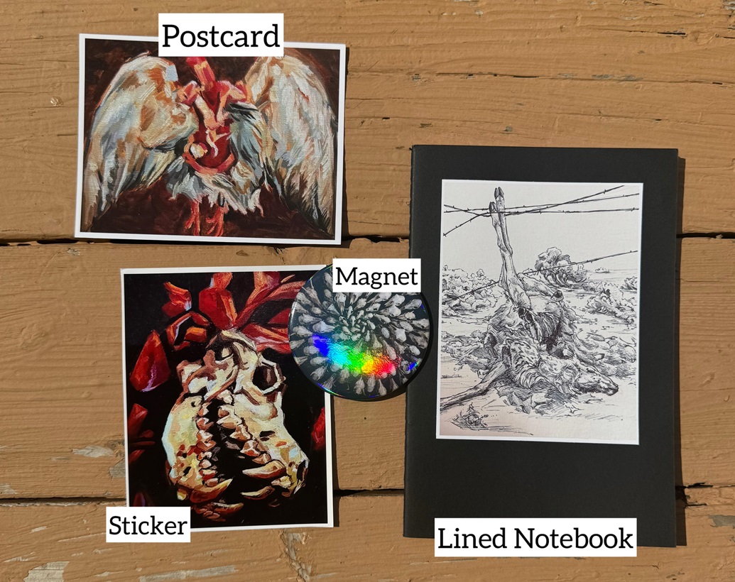 Includes printed items as a collaboration between a photographer and an artist, featuring beautiful dead animal paintings.