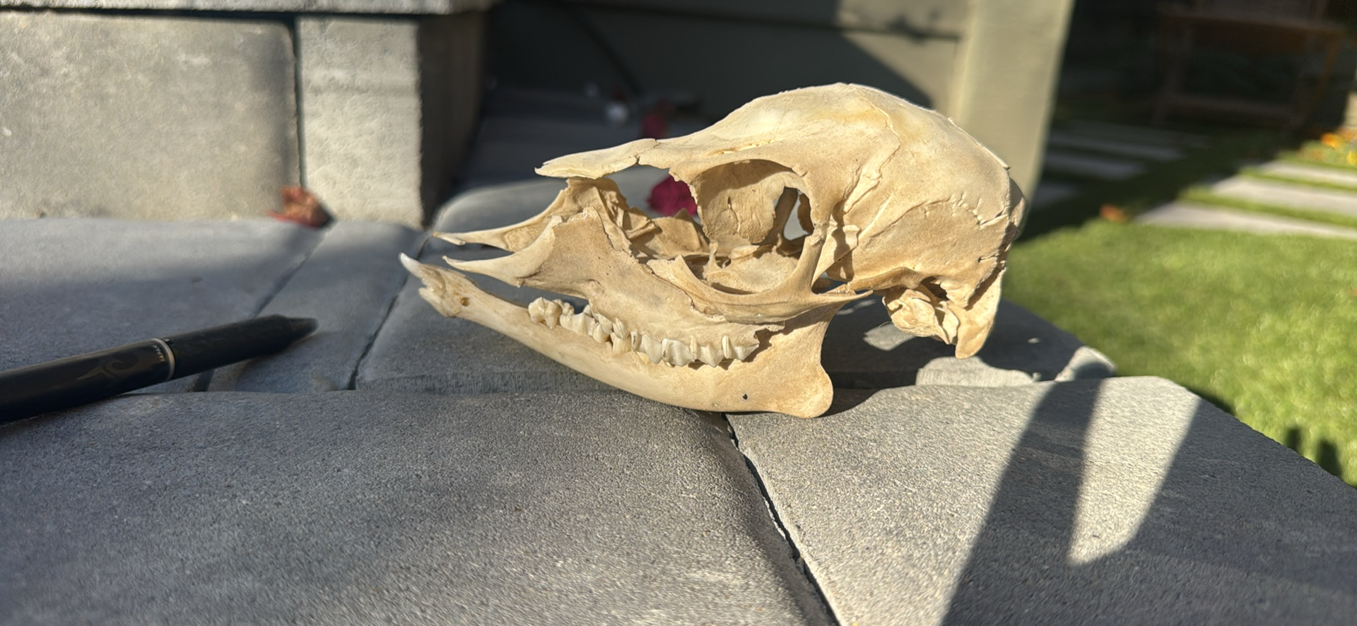 The skull of a baby mule deer. This is VERY light and papery and fragile and imperfect. Baby animal skulls are rare because they fall apart before you find them. I had to pull these pieces out of a mummified baby deer I found.